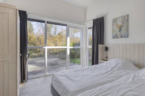 De hoofdslaapkamer is ingericht met een comfortabel tweepersoonsbed en biedt directe toegang tot het terras – een heerlijke plek om de dag te beginnen in de ochtendzon.