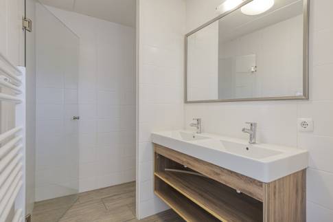 De moderne badkamer is uitgerust met een dubbele wastafel, een stijlvol houten meubel en een ruime inloopdouche met houtlook vloer. De luxe afwerking en warme uitstraling zorgen voor een spa-achtige sfeer. Daarnaast is er een separaat toilet met wandcloset en fontein.