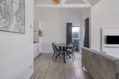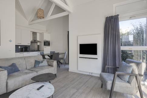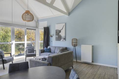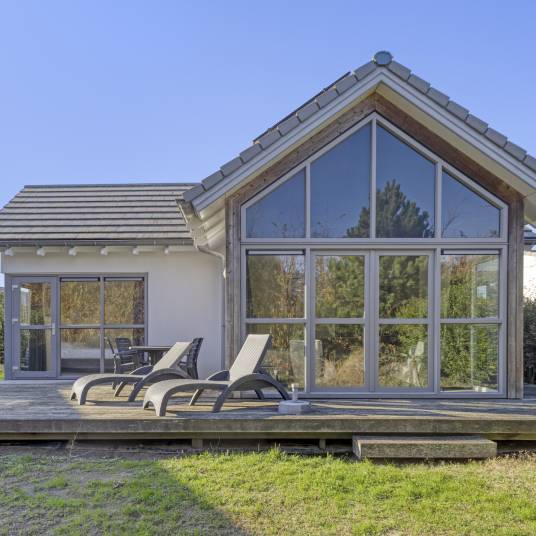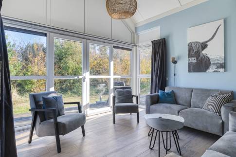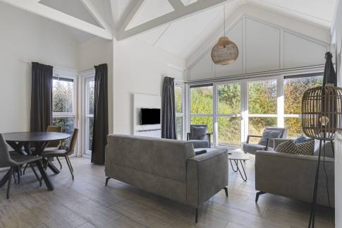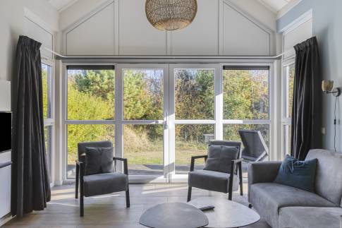 De moderne woonkamer vormt het hart van deze vakantiewoning. Grote ramen en openslaande deuren zorgen voor een overvloed aan daglicht en een directe verbinding met het terras. De stijlvolle inrichting en neutrale kleuren creëren een rustige, ontspannen sfeer – ideaal om tot rust te komen na een stranddag of om gezellig samen te zijn met familie en vrienden.