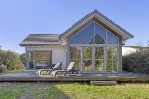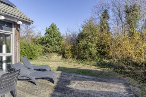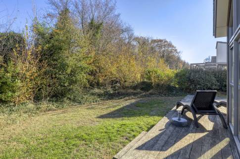 De gelijkvloerse woning ligt op een royaal perceel van 510 m² eigen grond en beschikt over drie slaapkamers, één moderne badkamer en een separaat toilet. Dankzij de grote raampartijen en openslaande deuren is de woning heerlijk licht en staan binnen en buiten in direct contact met elkaar. Op het ruime houten terras geniet je de hele dag van de zon en het vrije uitzicht.