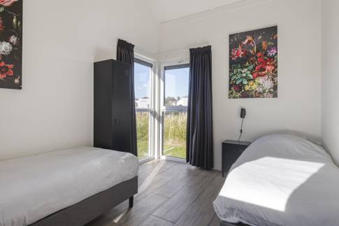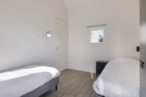 De tweede slaapkamer beschikt over twee eenpersoonsbedden en heeft een frisse, moderne uitstraling – ideaal voor gasten of kinderen.