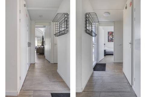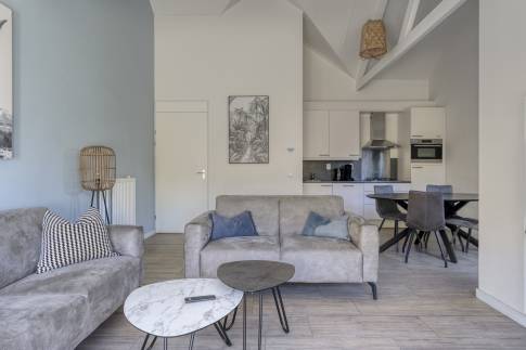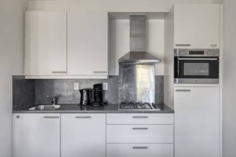 De open keuken is volledig uitgerust en combineert design met functionaliteit. Je vindt hier onder andere een gaskookplaat, rvs-afzuigkap, combi-oven, koelkast met vriesvak en vaatwasser. Het strakke werkblad biedt volop ruimte voor het bereiden van maaltijden. De keuken vormt samen met de eethoek het sociale middelpunt van de woning.