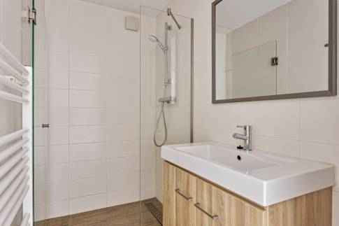 De woning beschikt over 2 slaapkamers, elk met een eigen badkamer en-suite, wat een luxe en comfortabel gevoel geeft. Via de grote raampartij in de woonkamer betreed je de tuin, die op het zuidoosten ligt, ideaal om te genieten van de zon.